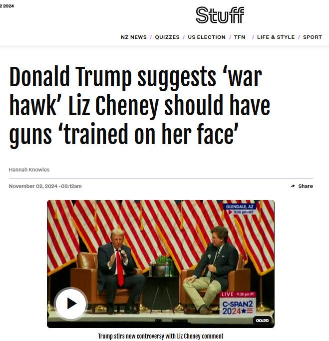 The New Zealand headlines all screamed about Trump’s comments that Liz Cheney should be fired upon with guns. Shocking comments.