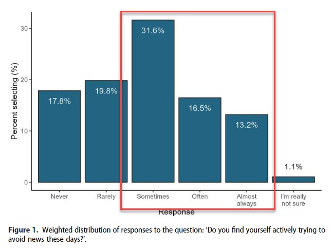 They found that 60% of survey participants reported they sometimes, often, or almost always avoid the news. If you add in the “rarely avoid it” 81% avoid it to some extent.
