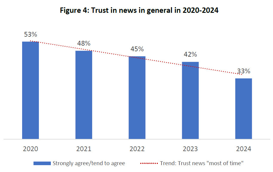 In 2020, 53% of New Zealanders trusted news in general. In 2024, that figure was at 33%. In five years, general trust in the news has fallen 20 percentage points. Just 1 in 3 NZ’ers trust the news media.