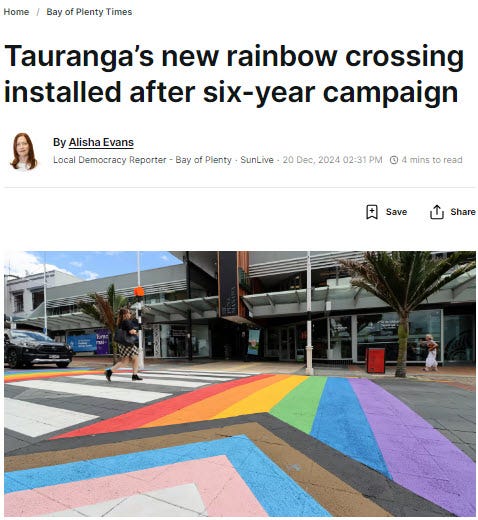 So Tauranga Council, Gisborne Council and Auckland Council with their rainbow crossings aren’t listening to ratepayers. It’s time they focused on the basics of good local council governance - traffic, parking, rubbish, sewage, water, & safety issues.