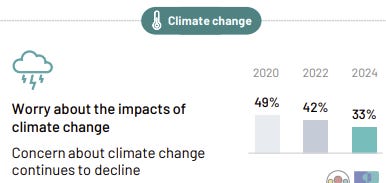 In 2020, according to this survey, just under half of us worried about the impacts of climate changes. That is now down to a third. 100% of the media are panicking about climate change, as are the Government and the opposition it seems. But the general public – nope, bigger things to think about.