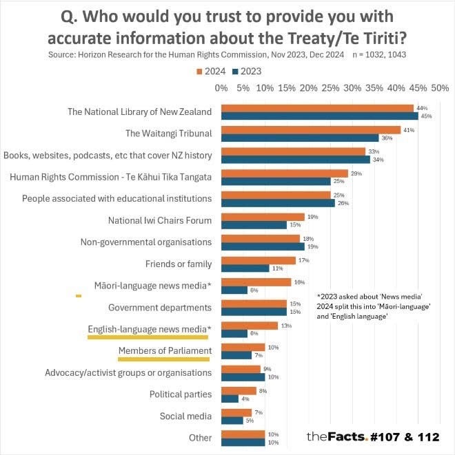 The National Library of NZ, the Waitangi Tribunal, the Human Rights Commission and podcasts and history books on the Treaty are more trusted – but even then none of them are above the 50% trust mark. No organisation is trusted by more than 50% of the population on this issue.